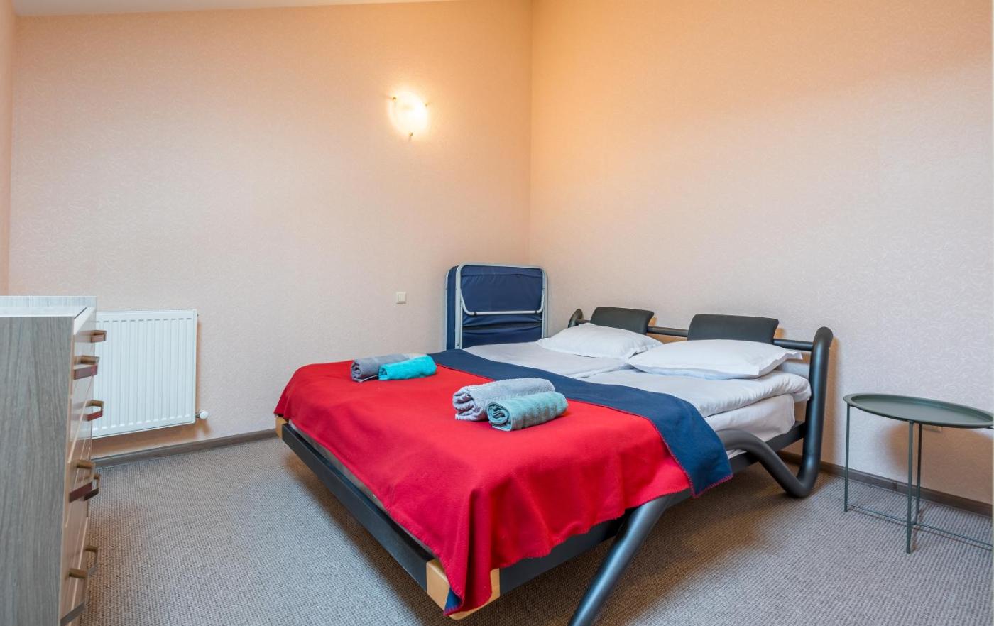 Three-Bedroom Apartment. The apartment has two bedrooms on the 2nd floor that have one queen bed for each bedroom. Additionally, there is one extra bed in one of the bedrooms. Plus, there is another queen bed on 1st floor and 2 sofa beds. So, in total there are 3 queen beds, 1 extra bed and 2 extendable sofas which mean at maximum 9 people can stay at the apartment.